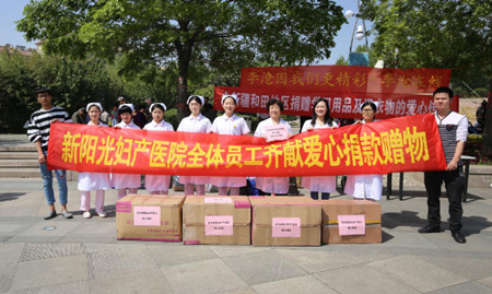 青岛新阳光妇产医院全院人员积极捐款捐物,纷纷从家里带了了闲置的衣服还有孩子的书、书包、铅笔等学习用品。截止到5月7日上午9点,医院共计捐款一万一千元整,在业务杨院长的带领下,医院工作人员将捐赠的物资和物品,送到了李村文化广场。