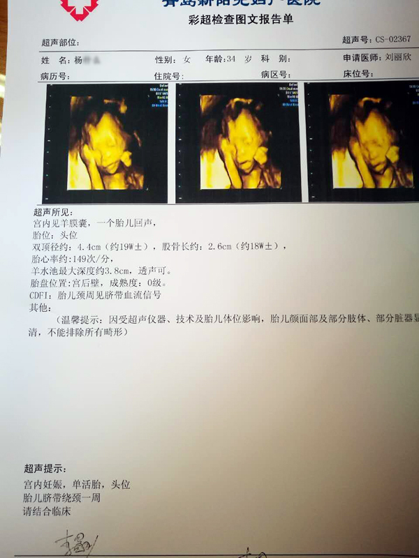 回到家后杨女士一直按照刘丽欣主任的叮嘱。经过90多天的治疗后,再到医院复诊时检查尿液呈HCG阳性,B超显示杨女士已经怀孕19周了,杨女士终于如愿以偿了。