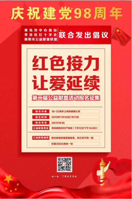 在青岛市中心血站、李沧区红十字会、新阳光公益献血联盟联合倡议下,“红色接力•让爱延续”第二届青岛新阳光公益献血活动将于2019年7月12日启动,值此中国共产党建党98周年之际,联合发出议:捐一份热血,献一片爱心,人人为我,我为人人,无偿献血,无尚光荣。”