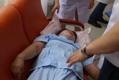 她是一位两个孩子的妈妈,献血后立即为病患服务,谁知止血带突然脱落,鲜血从血管中喷射而出,现场工作人员对其做紧急处理。