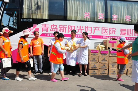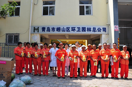 高温下工作十分辛苦,体力消耗非常大,为使环卫工人们能够安然度夏,8月12日,青岛新阳光妇产医院的几位领导干部先后来到李沧区环卫局、崂山区环卫园林总公司对在高温下兢兢业业工作的环卫工人表示真诚的慰问。医院给环卫工人们发放了清凉防暑用品,并嘱咐她们在确保卫生整洁的前提下,要注意高温避暑,合理安排工作和休息时间,注意保重身体。青岛新阳光妇产医院工会主席陈建薇在接受青岛电视台记者采访时说:“最近天气比较炎热,各位环卫工人比较辛苦,希望我们可以给大家带来一丝清凉。青岛新阳光妇产医院愿意为各位环卫工人免费查体,为青岛的环卫事业保驾护航!”