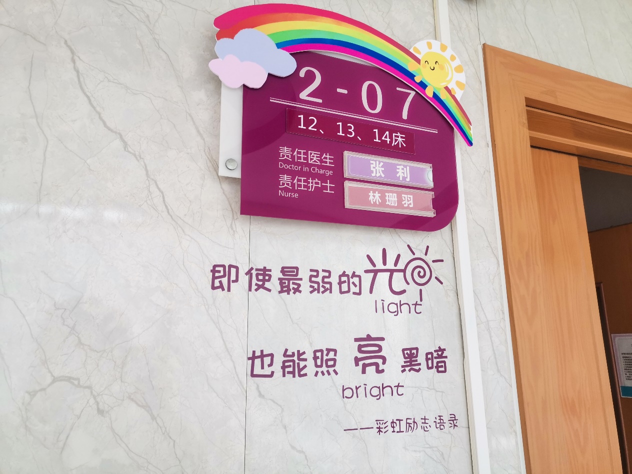 走进彩虹住院部,随处可见的是象征着温暖希望、驱散病痛的七色彩虹元素,小到每一位在院护士佩戴在胸前的彩虹胸牌和写在病房旁的彩虹励志语录,大到连通整个住院部的彩虹之路与承载着无数健康祝福的彩虹涂鸦墙,每一处的贴心设计都是为了让居住在此的每一位患者从踏入住院部开始,便能够感受到每一分光的温暖色彩,时刻保持一个健康阳光的诊疗心态。
