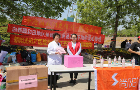 2016年5月7日上午10:00,青岛新阳光妇产医院携手李沧在线在李村文化广场开展了向新疆和田地区捐赠旧衣物和学习用品的爱心活动。