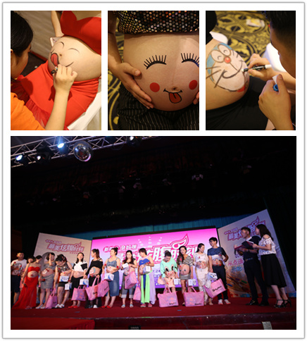 最美炫“腹”时刻·阳光魅力孕妈咪肚皮彩绘SHOW活动的最大亮点,就是孕妈咪彩绘走秀。伴随着音乐,“孕妇模特”们陆续走上T台,脸上笑容洋溢,走姿虽不是标准的猫步,但也有模有样,转身、 POSE一个不落,动作自然、洒脱。准妈妈们不仅没有一丝害羞,反而多了几分骄傲和自豪,赢得台下阵阵掌声。女人味十足的裙装,裤装的风格传递了青春动感、活力四射的精神状态;穿上婚纱的孕妈妈则陡然变身为大自然中清新的精灵,仙气飘飘,“孕”味十足。台下不仅准爸爸来助威,甚至双方爸爸妈妈和亲友们也都来到了现场,感受着现场的轻松愉悦氛围。