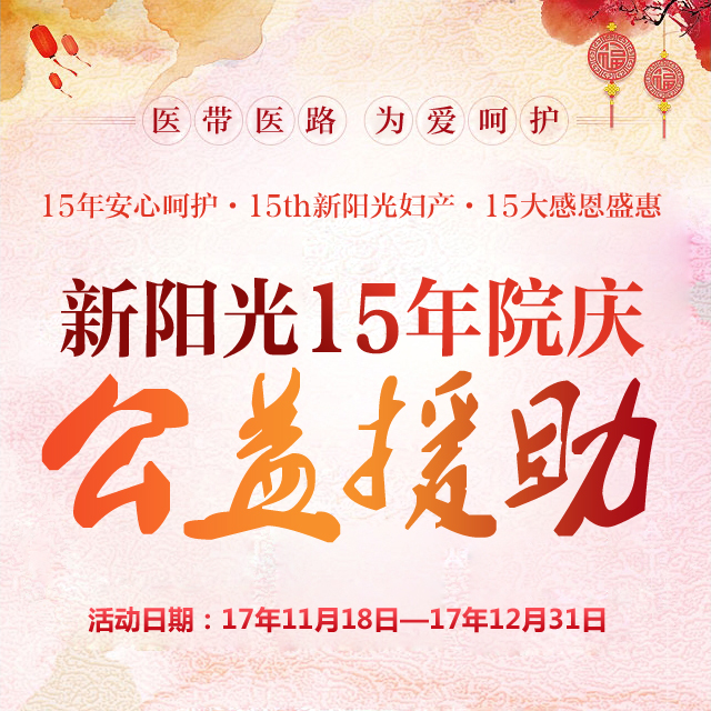 为回馈广大女性朋友的支持与厚爱,11月18日——12月31日,在中国医师协会、北京女医师协会、北京协和医院、北京妇产医院等权威医疗机构的技术协作下,新阳光妇产医院举办“医带医路 为爱呵护”15周年院庆特别活动,由太平洋助医资金会提供百万健康资金,用于六大健康套餐、六大手术援助、三大产科分娩等惠民举措,并准备了价值6000元的苹果笔记本电脑、价值2000元的海尔母婴空气净化器、价值1000元的格兰仕多功能电烤箱等居家电器,用于院庆期间的“幸运大抽奖”,其目的在于提升全社会对母婴健康的关注,将实惠切实落在老百姓的心坎上。院庆期间,医院还会陆续开展“甜蜜为你而来”孕妈咪蛋糕DIY、“妈妈我从哪里来”幼儿生命溯源教育、社区贫困家庭精准扶贫等一系列公益活动。