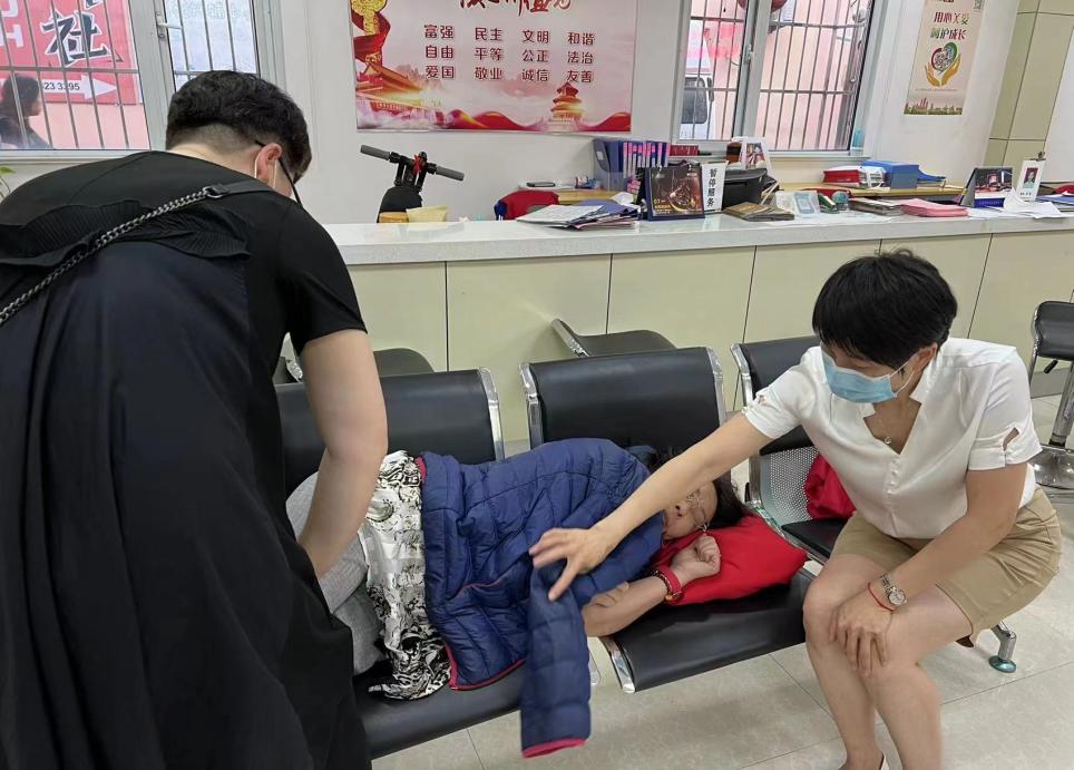 7月8日,书院路新阳光社区卫生服务中心儿保科护士长刘红,随采样队来到青峰路社区采样点进行采样。当天气温高热,居民多,工作量大,连续工作的刘红护士长,出现恶心头晕不舒服的症状。她浑身不停出汗,时不时感觉胸闷气短,她强忍不适坚持进行核酸采样。晚上18:00分,刘红再也支撑不住了,眼前发黑,晕倒在地。