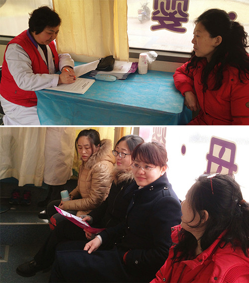 众多女性朋友在候诊区等待,体检车内暖风阵阵,工作人员还为她们准备了热水。